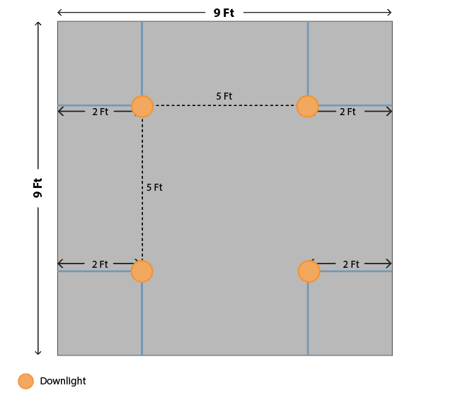 Sau khi vạch ra điều này, bạn có thể đánh giá số lượng đèn chiếu sáng bạn cần để tương ứng với kích thước diện tích của căn phòng của bạn. Hãy giả sử căn phòng của chúng ta với trần nhà dài 10 foot, dài 9 foot và rộng 9 foot.